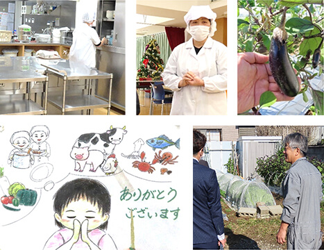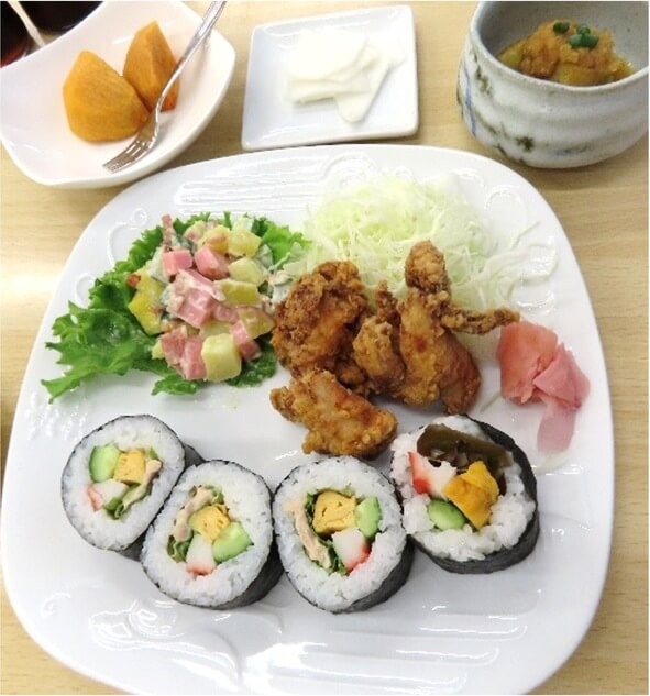 調理員さん:「子どもたちが一番好きなのは唐揚げで、取り合いになるほど(笑)。野菜を食べてもらうために、ドレッシングはマヨネーズとレモンを工夫したり、和風の胡麻油ベースにしたりと、いつも一工夫しています。先日子どもたちが掘った芋と、ご近所からいただいた芋を使って2種のさつま芋サラダに。お吸い物は、味噌汁より喜んでくれた卵と豆腐の吸い物を。巻物も、新しく入った職員の腕前を振るわせていただきました。すべては子どもたちが喜んで、野菜も美味しく食べられるようにという理事長の意向を大切にしています。」